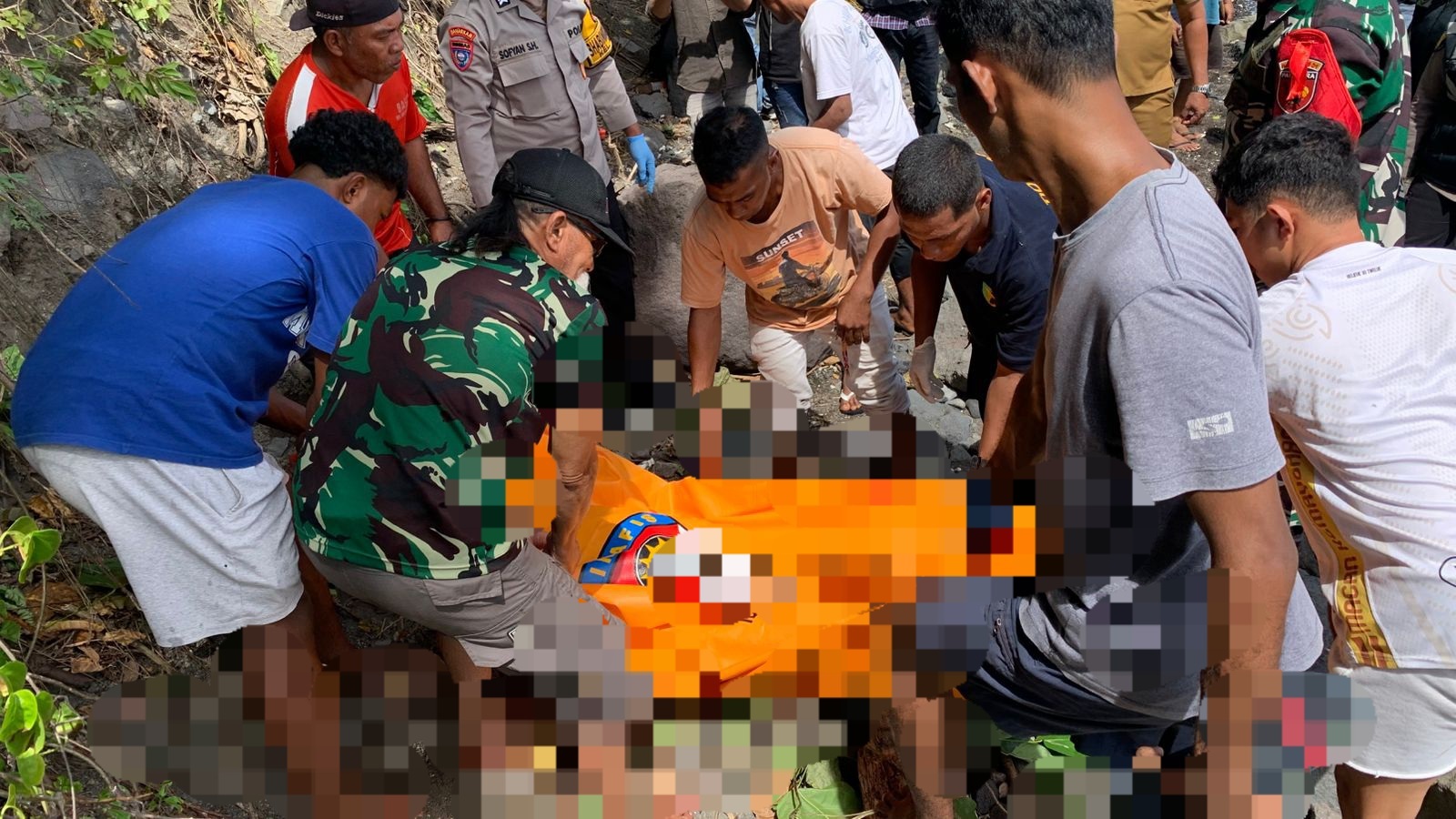 Pantauan dilokasi penemuan mayat, terlihat korban dengan posisi terkapar diatas bebatuan itu terdapat beberapa luka gores dibagian kaki dan tangan. Begitupun, pada wajah korban mengalami luka parah.