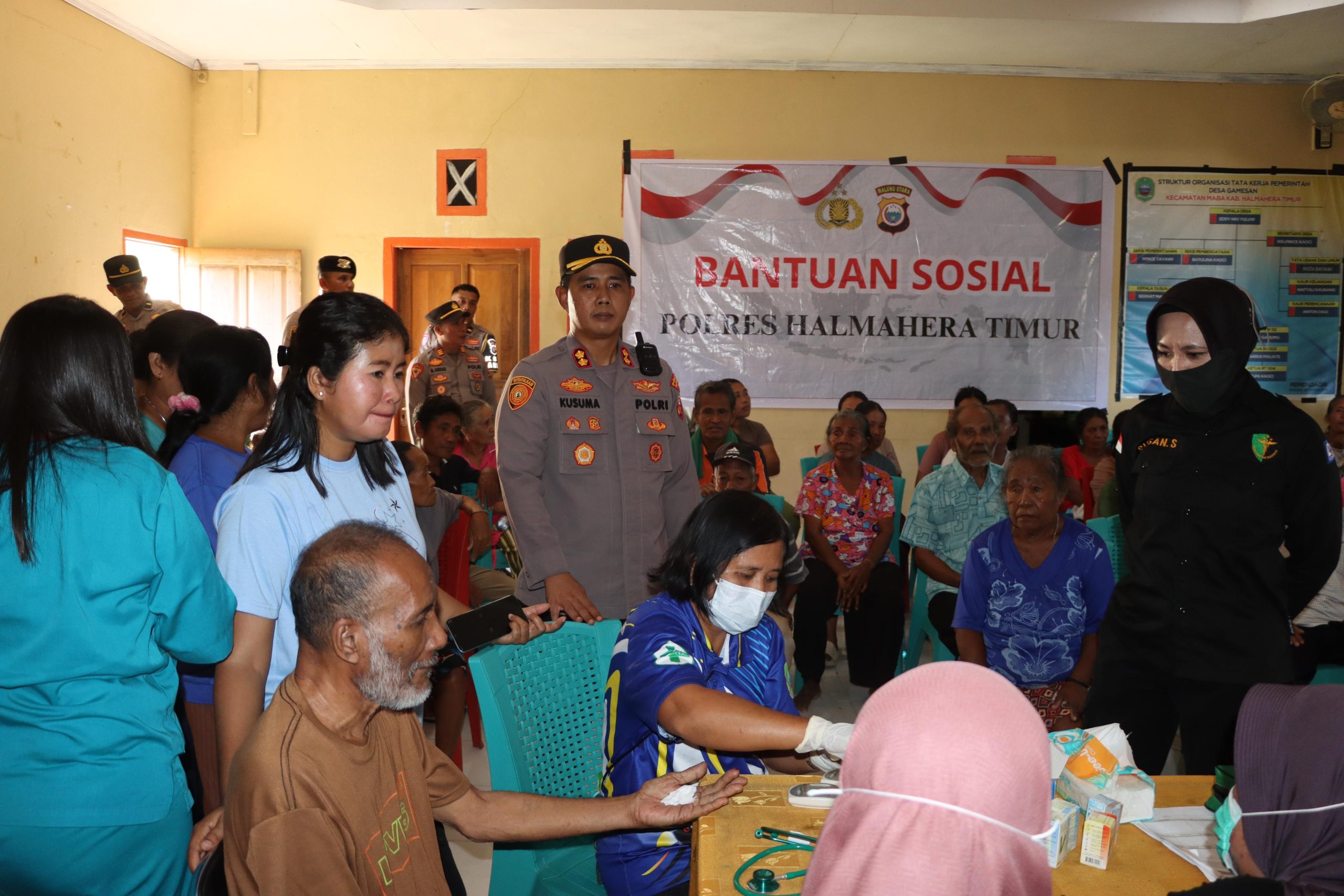 Kapolres Halmahera Timur, AKBP Bobby Kusuma Ardiansyah, pimpin langsung penyaluran sembako dan pantau pengobatan gratis ke warga. (istimewa).