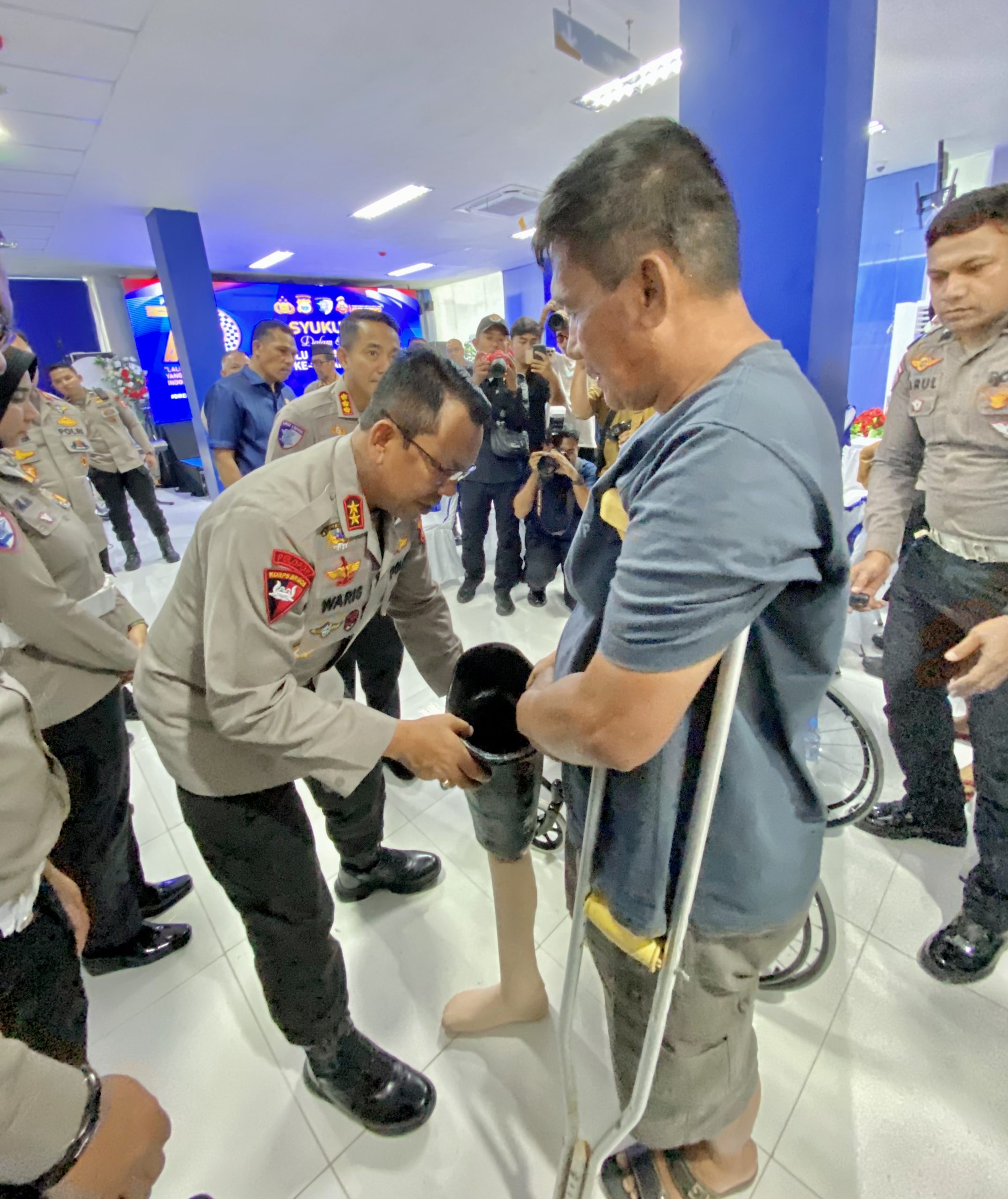 JAILOLO, iT – Kapolda Maluku Utara (Malut), Irjen Pol Waris Agono memberikan dua kaki palsu kepada dua warga penyintas korban laka lantas akibat kecelakaan lalu lintas di wilayah hukum Polda Maluku Utara.